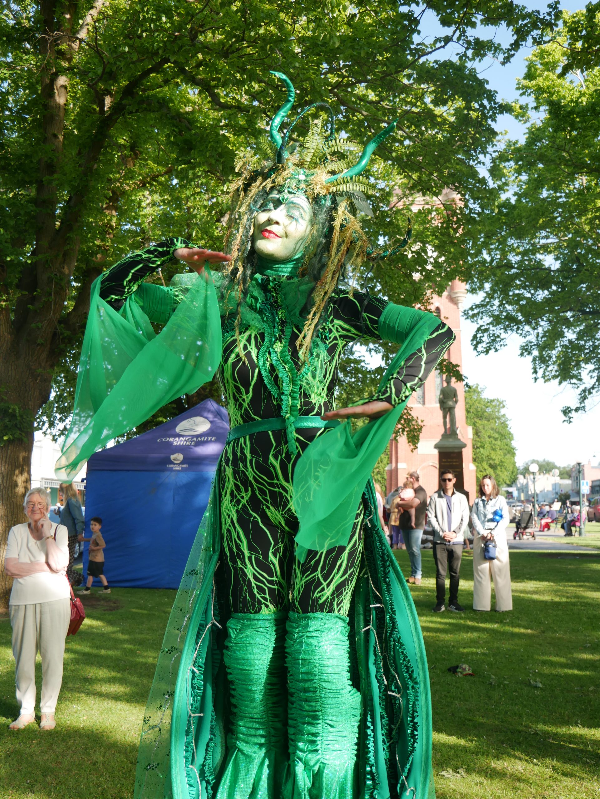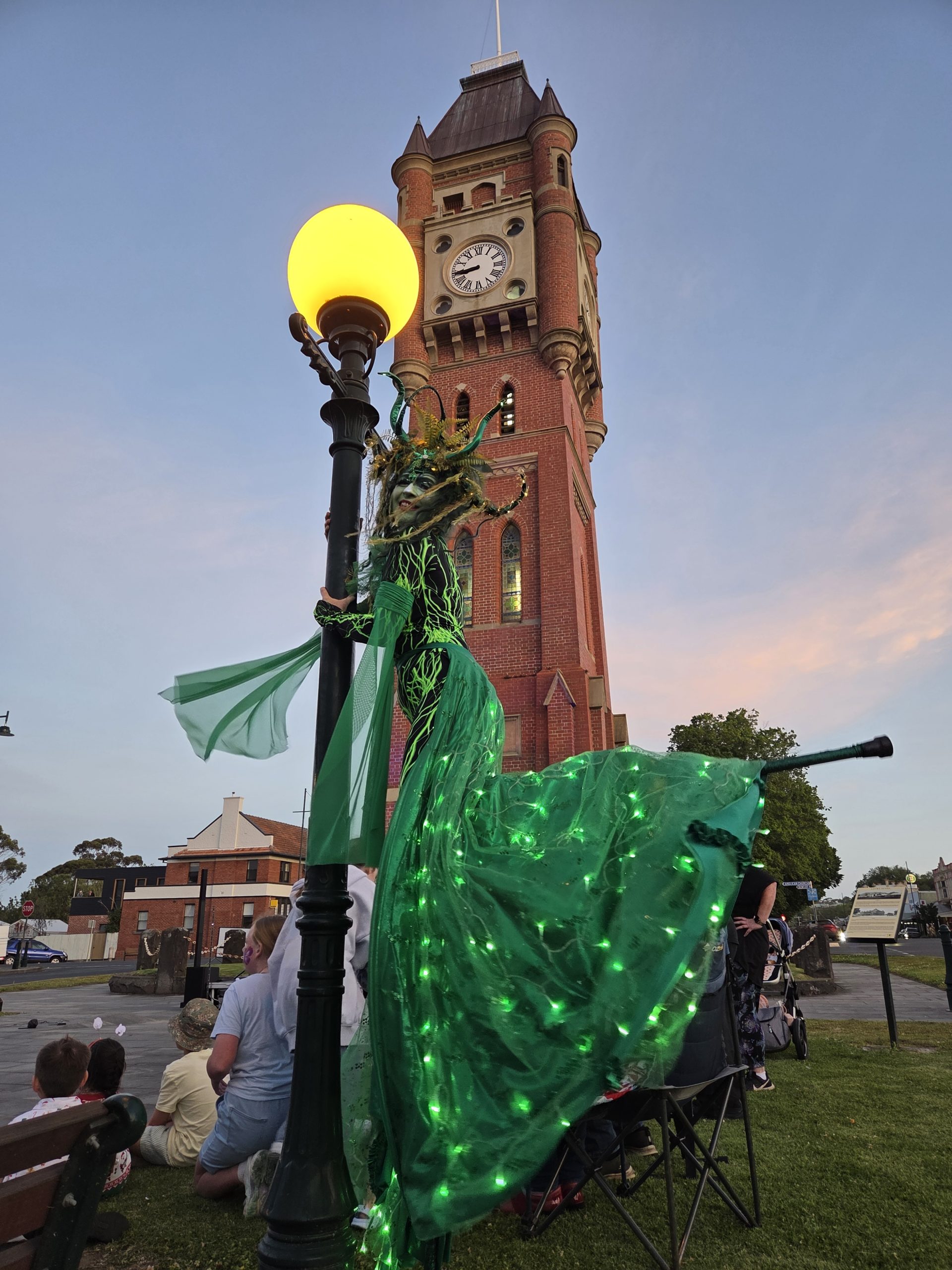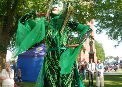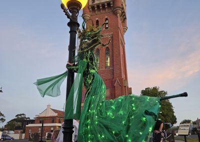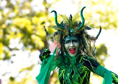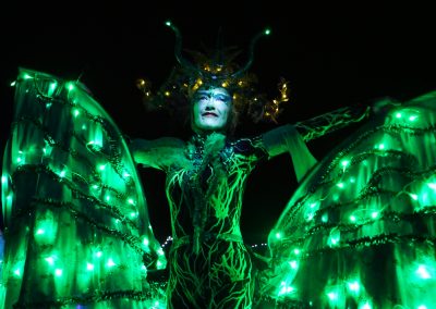 The Green Woman is a captivating and mischievious solo stilt-walking act that works well both day and night. With tangled hair of moss and ferns, she embodies the essence of the wild feminine and Celtic nature spirits. Fall under her spell as she glides gracefully from bough to bough with her enchanting dance. Emerald leaf wings come to life after dusk and illuminate like a sea of jewels, reminding us to protect and cherish our precious natural world.