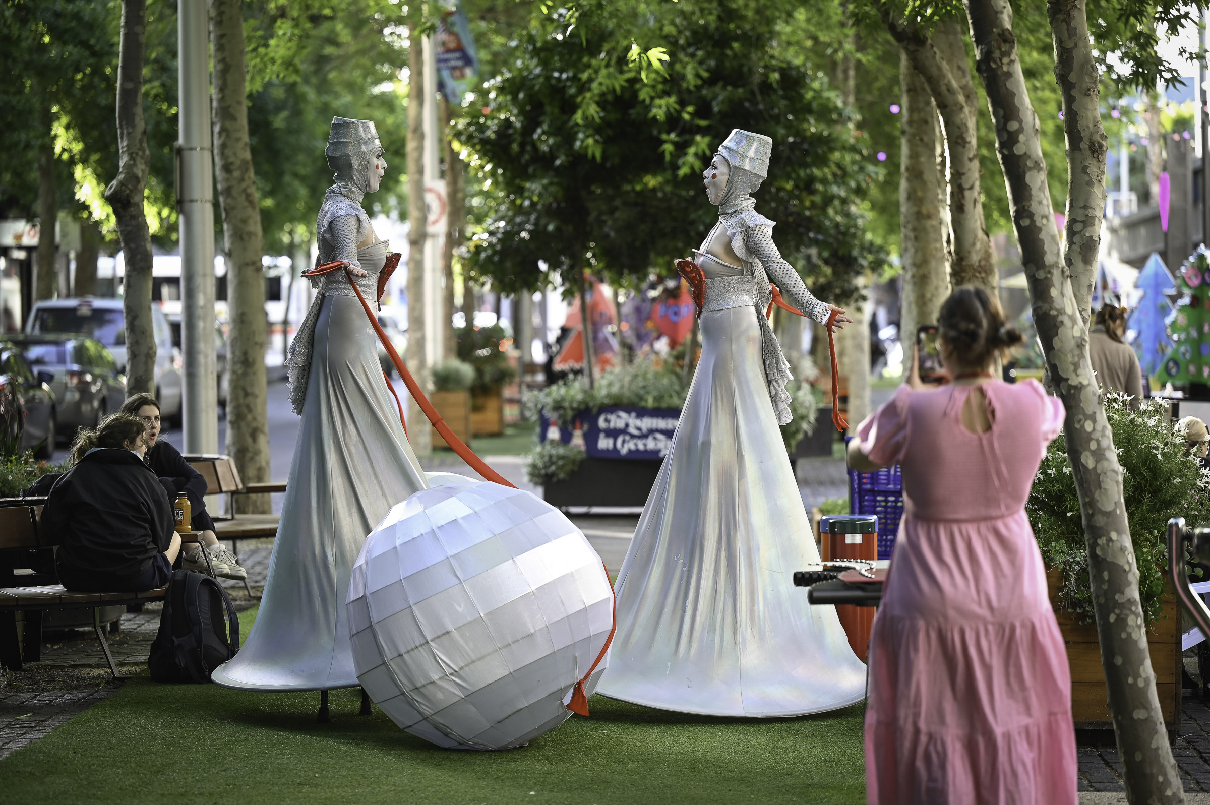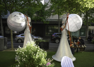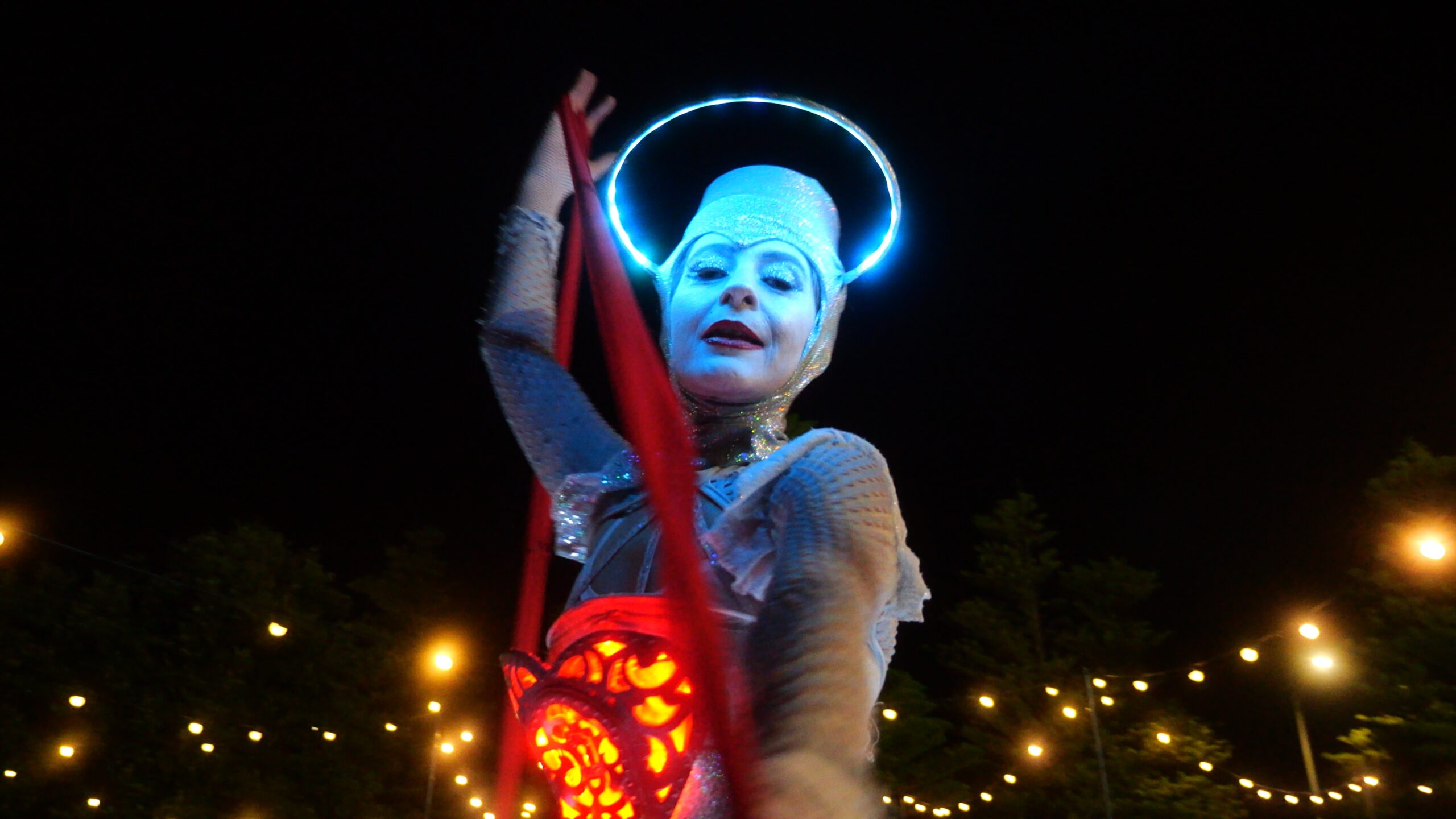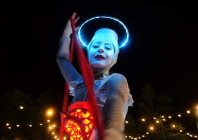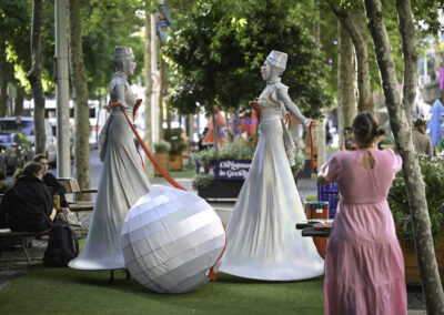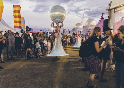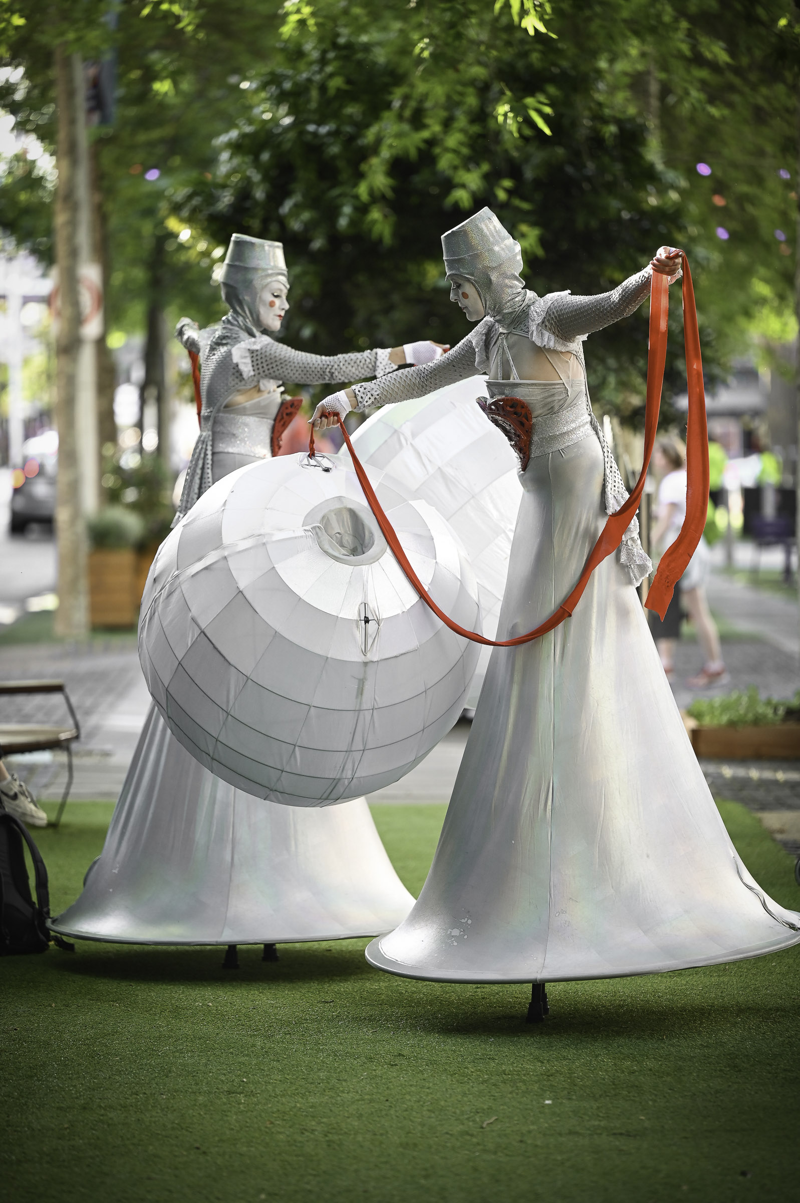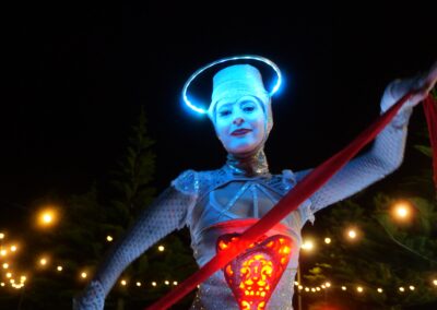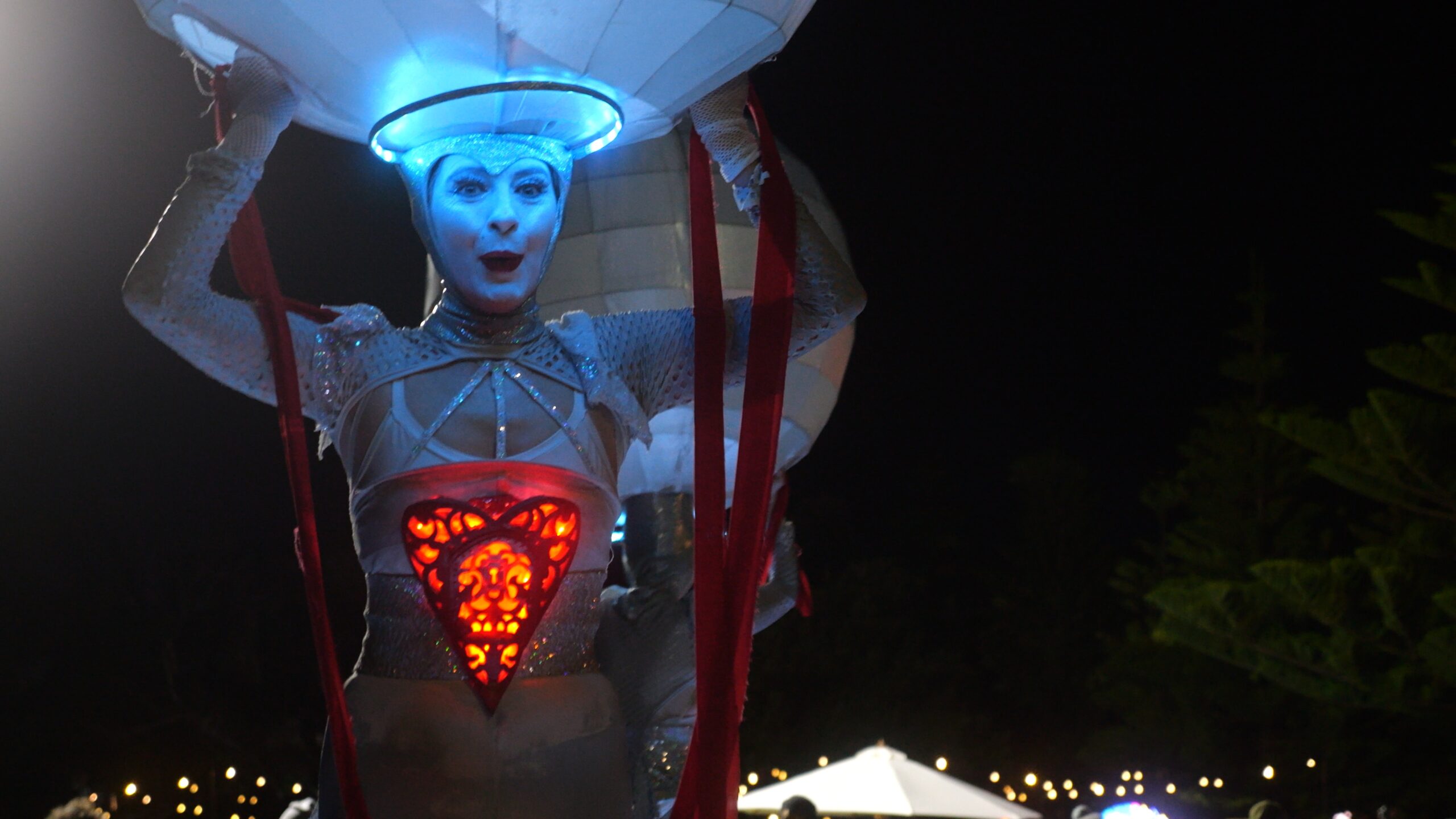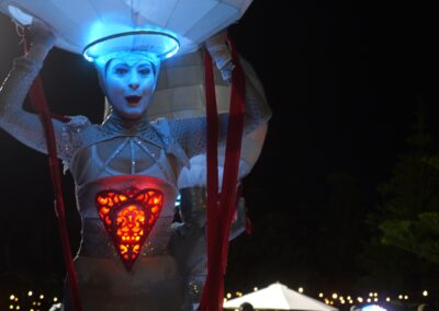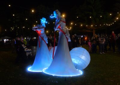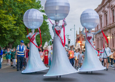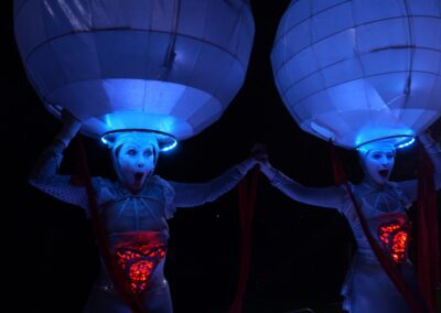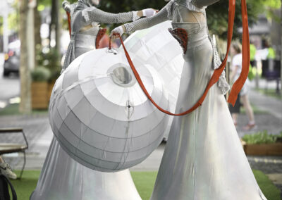 The Illuminates is a roving, two or three person sculptural performance that can be performed day or night, indoors or out and to a wide demographic ranging from children to adults. Inspired by european street theatre, the spectacular costumes reference giant celestial lanterns and larger than life moon people. Wonderful choreography is created as they float in orbit and their hearts glow red and become illuminated for the first time. The audience is mesmerised as these wondrous, otherworldly figures glide seemingly on air in graceful formations with their shimmering orbs and shining hearts. The performance has a dream-like quality and works beautifully during daylight hours, but really comes alive after sunset with the inbuilt LED lighting accentuating the choreography and drawing audience members from afar.